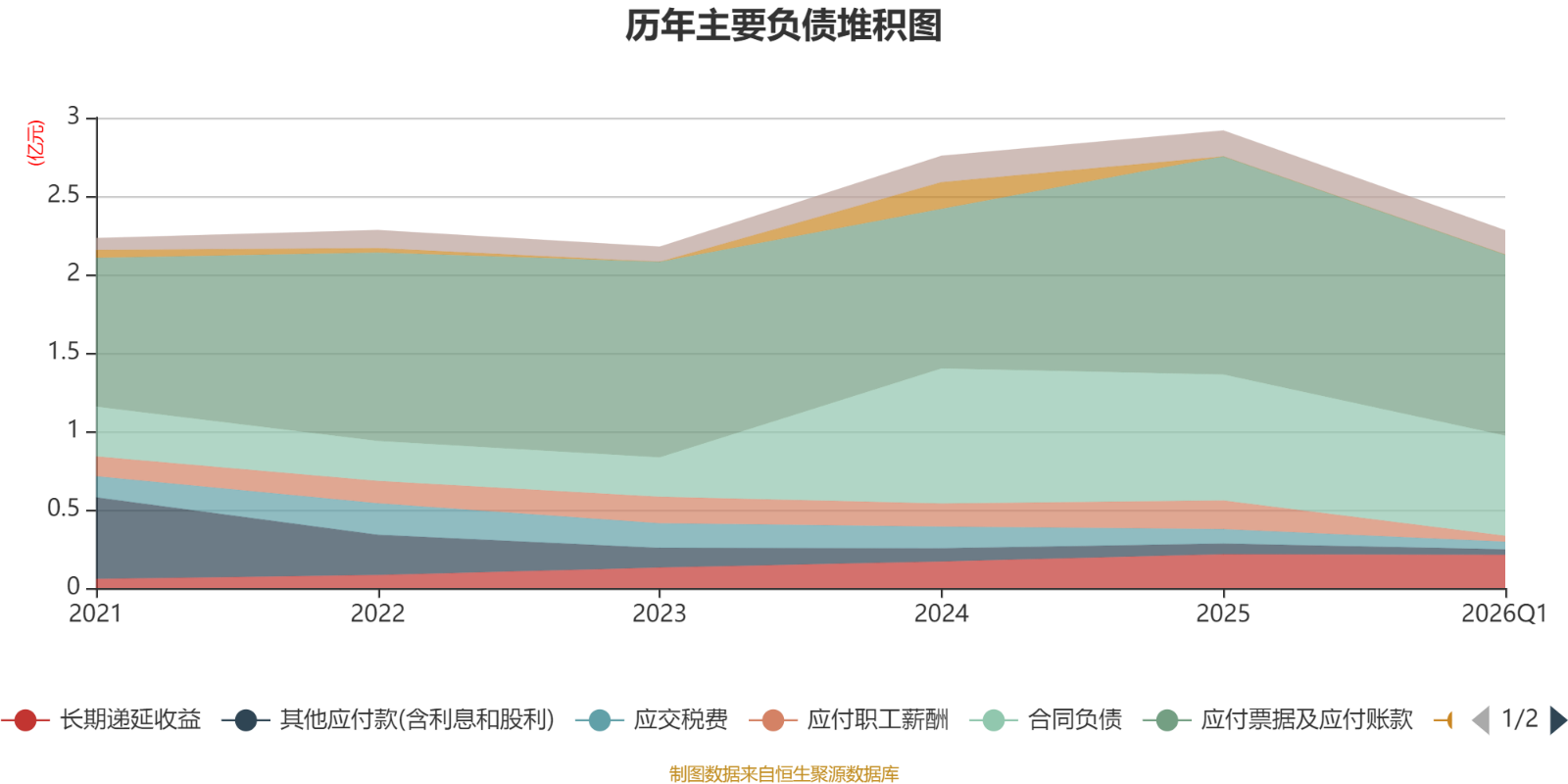负债重大变化方面,截至2026年一季度末,公司应付票据及应付账款较上年末减少16.98%,占公司总资产比重下降1.7个百分点;应付职工薪酬较上年末减少79.55%,占公司总资产比重下降1.51个百分点;合同负债较上年末减少20.44%,占公司总资产比重下降1.29个百分点;应交税费较上年末减少46.8%,占公司总资产比重下降0.42个百分点。