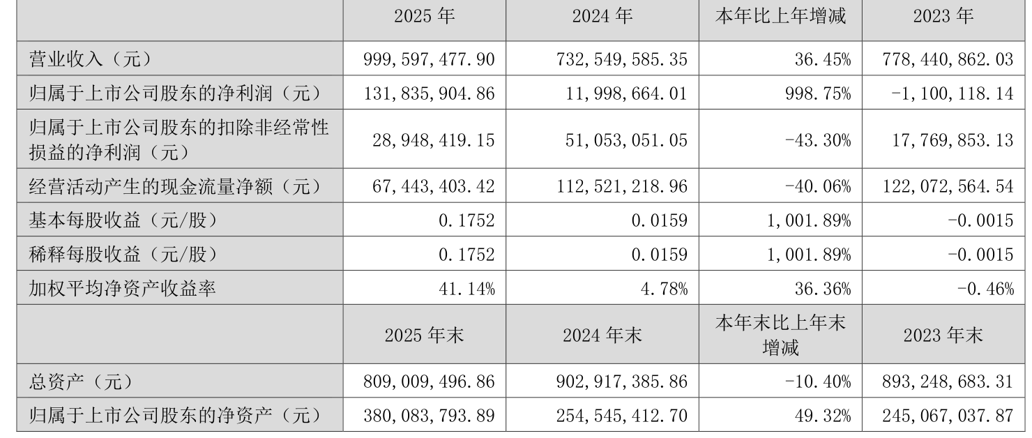 中证智能财讯升达林业(002259)4月15日披露2025年年度报告。2025年,公司实现营业总收入10亿元,同比增长36.45%;归母净利润1.32亿元,同比增长998.75%;扣非净利润2894.84万元,同比下降43.30%;经营活动产生的现金流量净额为6744.34万元,同比下降40.06%;报告期内,升达林业基本每股收益为0.1752元,加权平均净资产收益率为41.14%。