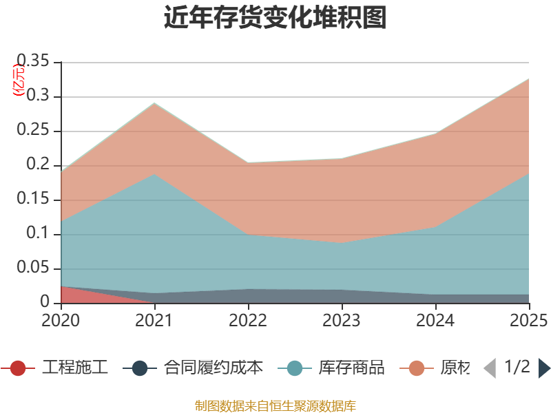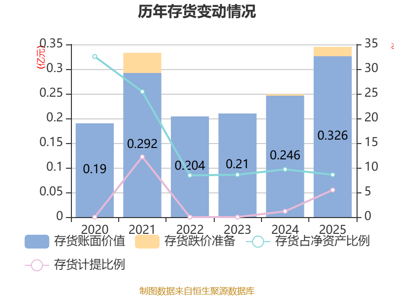 从存货变动来看,截至2025年末,公司存货账面价值为3260.22万元,占净资产的8.58%,较上年末增加799.13万元。其中,存货跌价准备为189.26万元,计提比例为5.49%。
