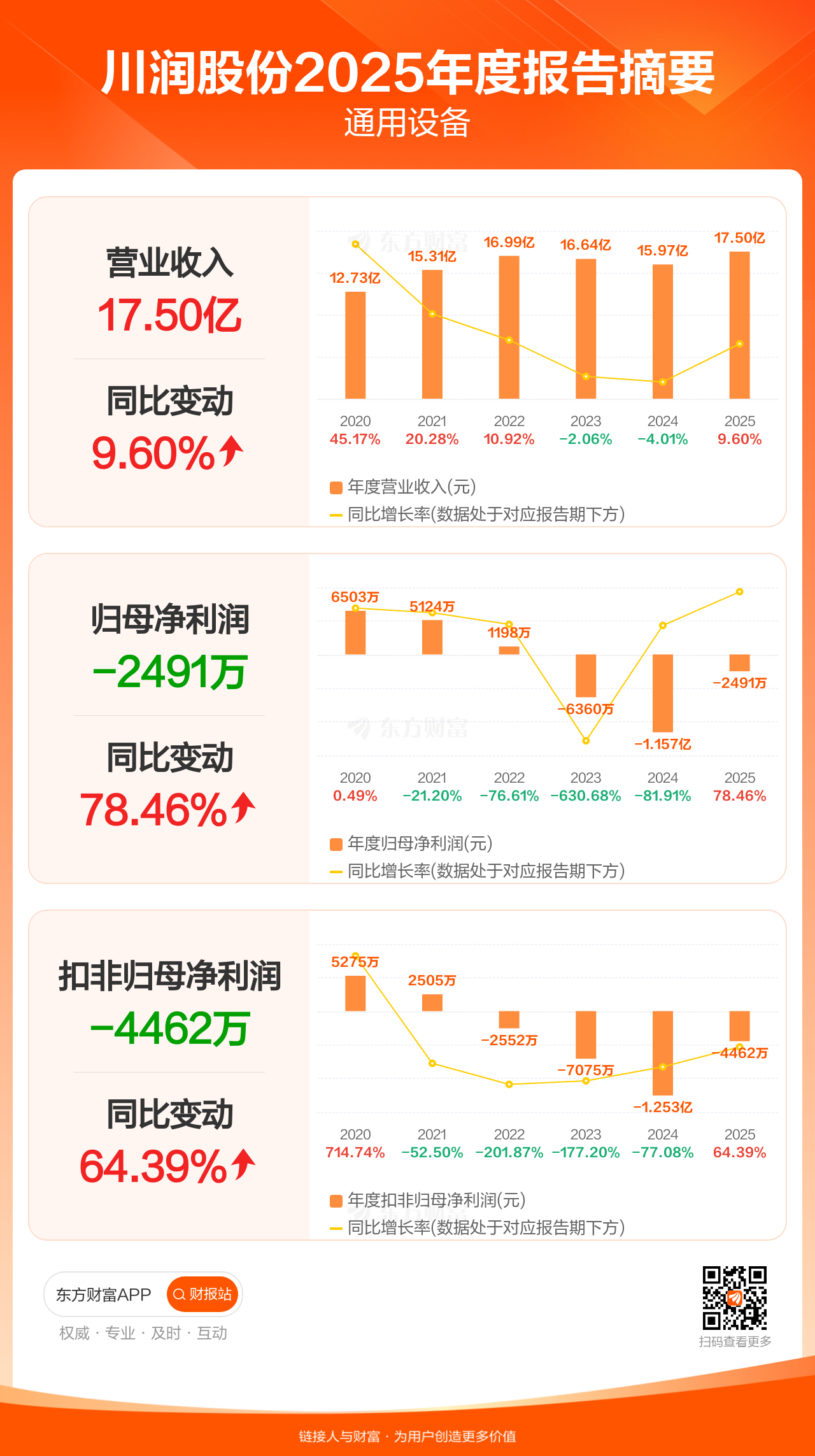 川润股份4月15日发布2025年年报显示,公司全年实现营业收入17.50亿元,同比增长9.60%;归母净利润-2491.42万元;扣非归母净利润-4461.93万元。