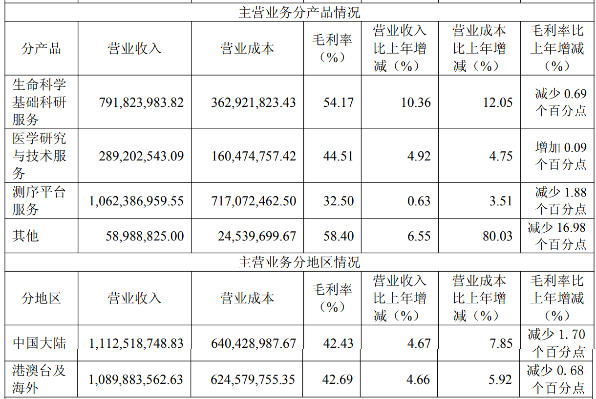 两大核心业务均出现毛利率下滑态势,其中主力业务测序平台服务营收增速近乎停滞,这一表现也指向了诺禾致源服务过于单一的“窘境”。
