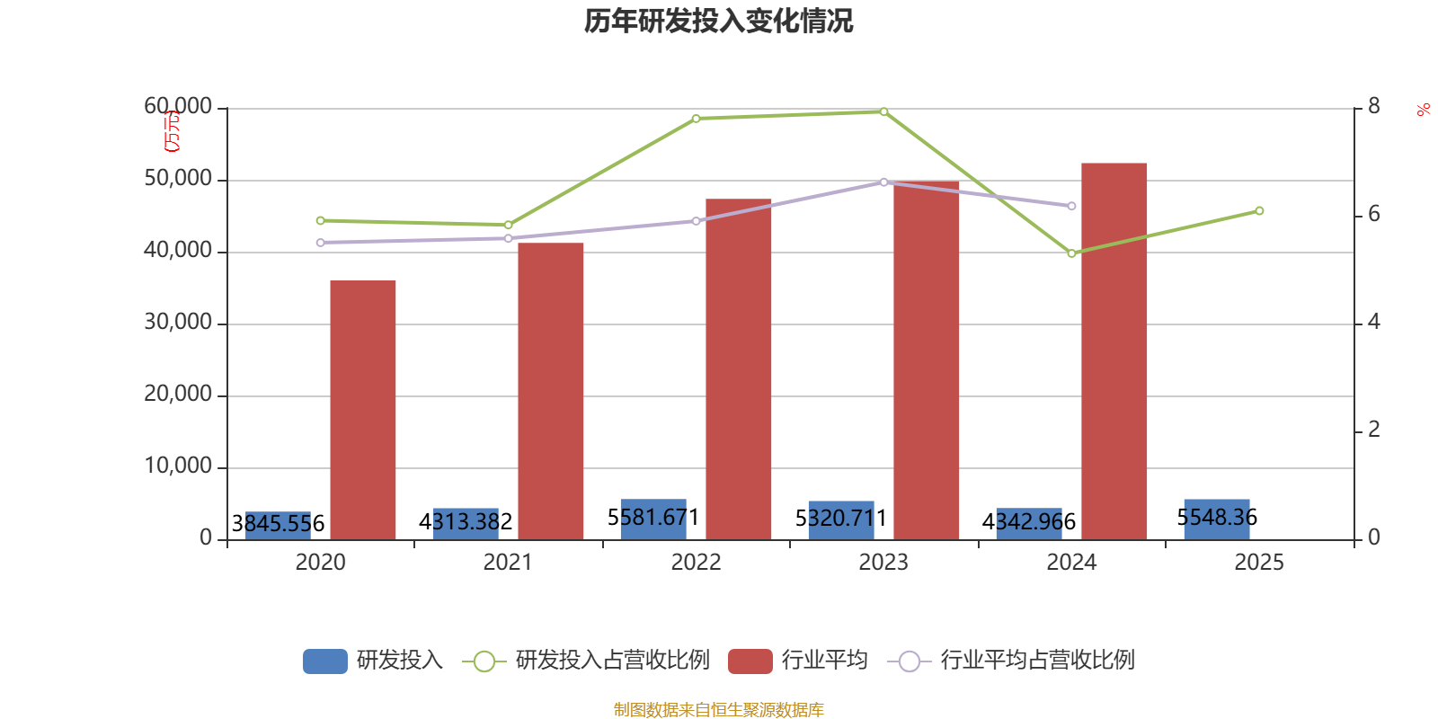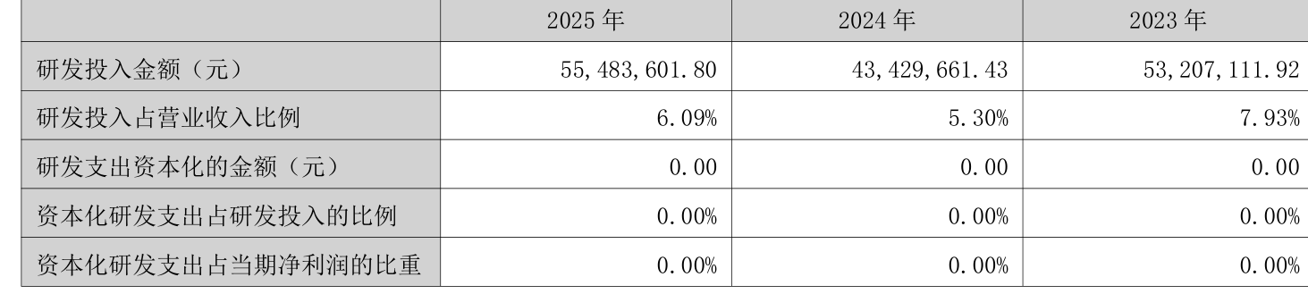 2025年全年,公司研发投入金额为5548.36万元,同比增长27.76%;研发投入占营业收入比例为6.09%,相比上年同期上升0.79个百分点。此外,公司全年研发投入资本化率为0%。