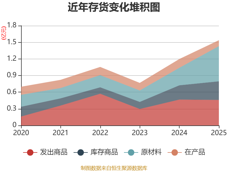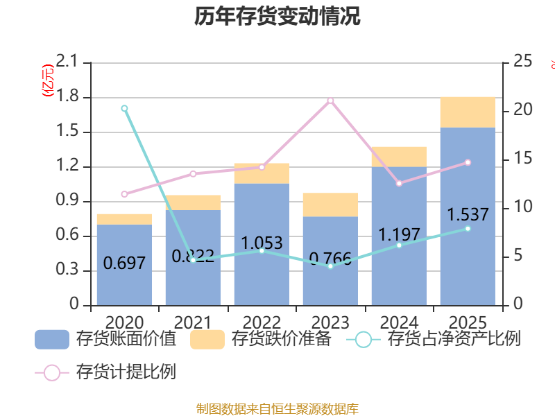 从存货变动来看,截至2025年末,公司存货账面价值为1.54亿元,占净资产的7.87%,较上年末增加3401.8万元。其中,存货跌价准备为2647.59万元,计提比例为14.69%。