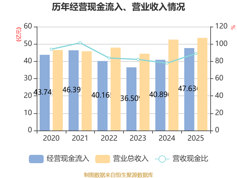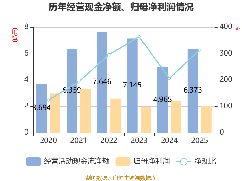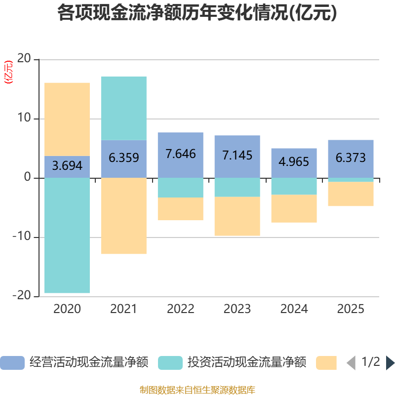 截至2025年,公司经营活动现金流净额为6.37亿元,同比增长28.34%;筹资活动现金流净额-4.06亿元,同比增加6363.31万元;投资活动现金流净额-7176.45万元,上年同期为-2.87亿元。