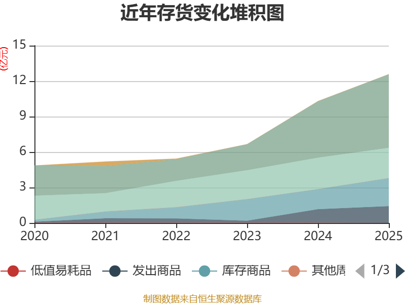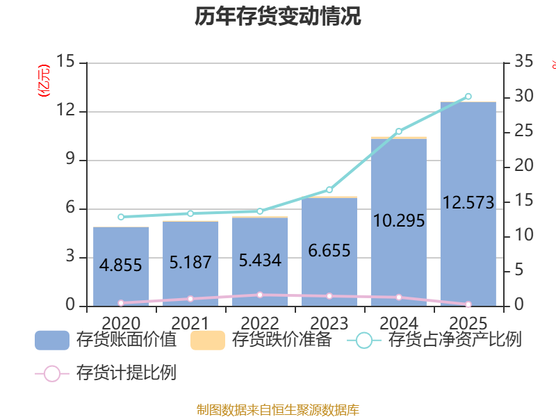 从存货变动来看,截至2025年末,公司存货账面价值为12.57亿元,占净资产的30.12%,较上年末增加2.28亿元。其中,存货跌价准备为268.19万元,计提比例为0.21%。