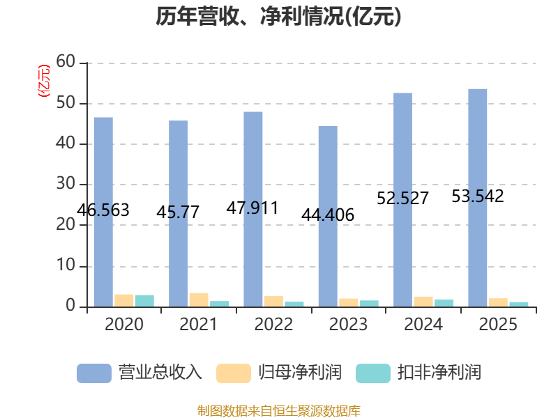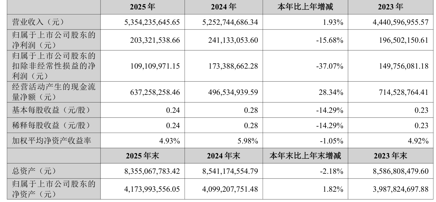 中证智能财讯富春环保(002479)4月15日披露2025年年度报告。2025年,公司实现营业总收入53.54亿元,同比增长1.93%;归母净利润2.03亿元,同比下降15.68%;扣非净利润1.09亿元,同比下降37.07%;经营活动产生的现金流量净额为6.37亿元,同比增长28.34%;报告期内,富春环保基本每股收益为0.24元,加权平均净资产收益率为4.93%。公司2025年度分配预案为:拟向全体股东每10股派现1元(含税)。