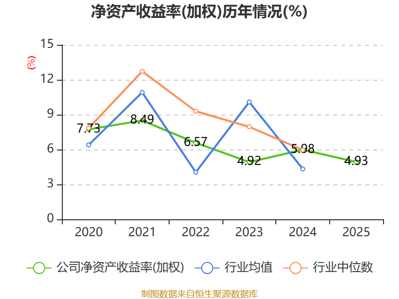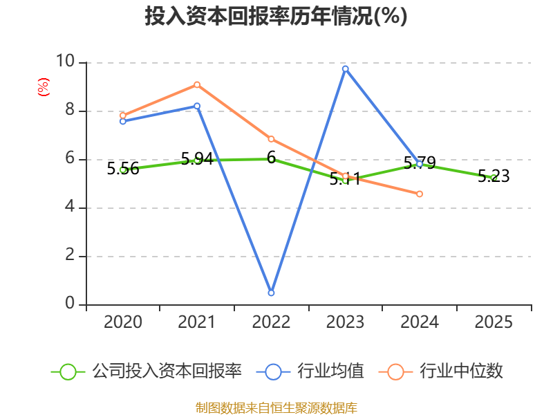 数据显示,2025年公司加权平均净资产收益率为4.93%,较上年同期下降1.05个百分点。公司2025年投入资本回报率为5.23%,较上年同期下降0.56个百分点。