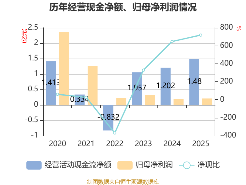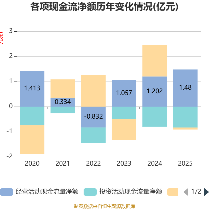 截至2025年,公司经营活动现金流净额为1.48亿元,同比增长23.08%;筹资活动现金流净额-785.3万元,同比减少1.33亿元;投资活动现金流净额-8350.6万元,上年同期为-8010.01万元。