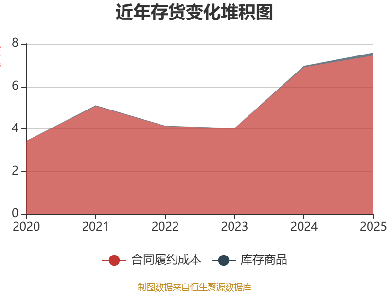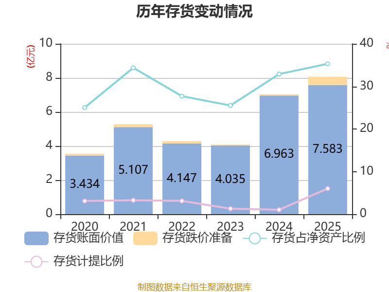从存货变动来看,截至2025年末,公司存货账面价值为7.58亿元,占净资产的35.3%,较上年末增加6202.34万元。其中,存货跌价准备为4847.31万元,计提比例为6.01%。