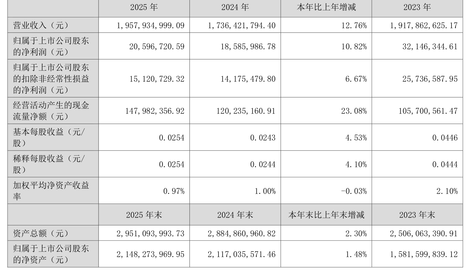 中证智能财讯长亮科技(300348)4月15日披露2025年年度报告。2025年,公司实现营业总收入19.58亿元,同比增长12.76%;归母净利润2059.67万元,同比增长10.82%;扣非净利润1512.07万元,同比增长6.67%;经营活动产生的现金流量净额为1.48亿元,同比增长23.08%;报告期内,长亮科技基本每股收益为0.0254元,加权平均净资产收益率为0.97%。公司2025年度分配预案为:拟向全体股东每10股派现0.07元(含税)。