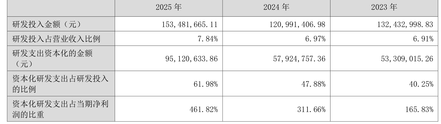 2025年全年,公司研发投入金额为1.53亿元,同比增长26.85%;研发投入占营业收入比例为7.84%,相比上年同期上升0.87个百分点。此外,公司全年研发投入资本化率为61.98%。