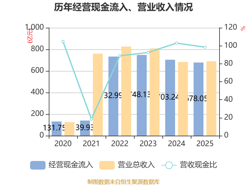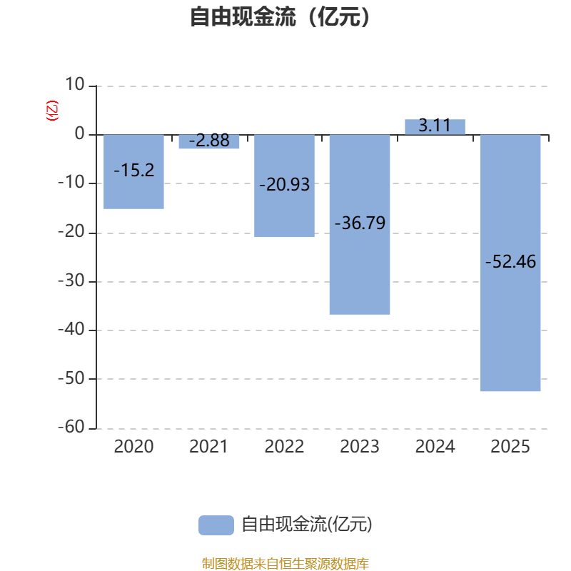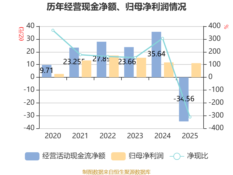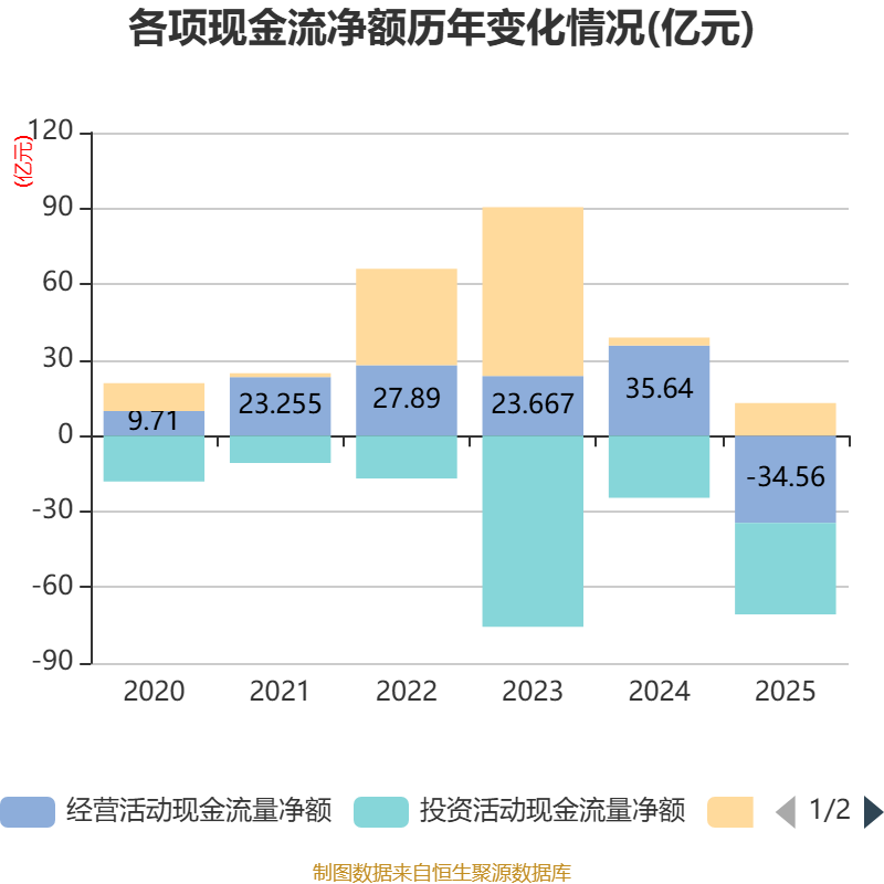 截至2025年,公司经营活动现金流净额为-34.56亿元,同比减少70.2亿元;筹资活动现金流净额12.93亿元,同比增加9.76亿元;投资活动现金流净额-36.18亿元,上年同期为-24.61亿元。