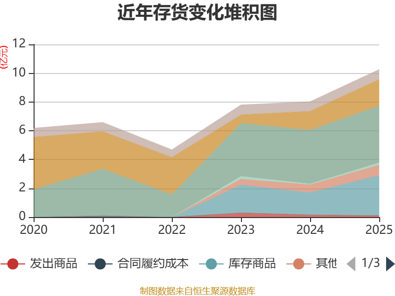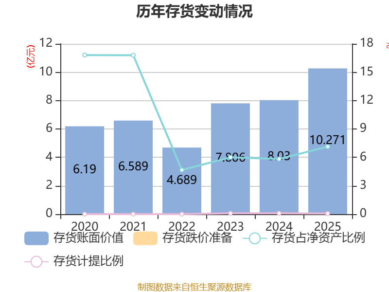 从存货变动来看,截至2025年末,公司存货账面价值为10.27亿元,占净资产的7.13%,较上年末增加2.24亿元。其中,存货跌价准备为69.43万元,计提比例为0.07%。
