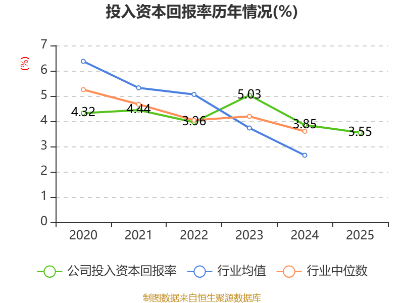 数据显示,2025年公司加权平均净资产收益率为7.9%,较上年同期下降0.89个百分点。公司2025年投入资本回报率为3.55%,较上年同期下降0.3个百分点。
