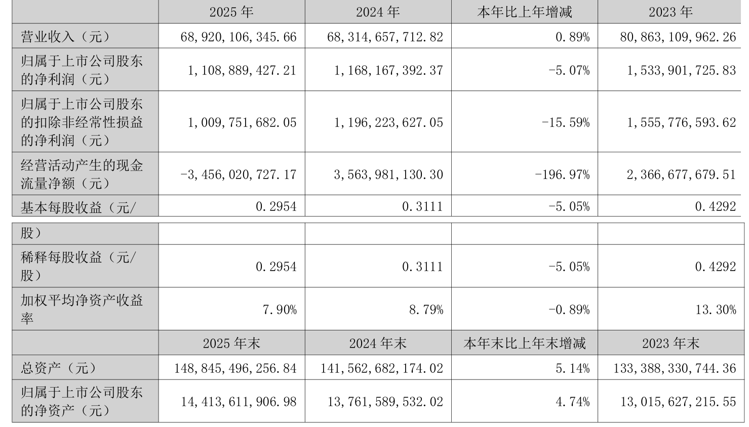 负债重大变化方面,截至2025年末,公司长期借款较上年末减少3.43%,占公司总资产比重下降1.36个百分点;一年内到期的非流动负债较上年末增加79.15%,占公司总资产比重上升1.06个百分点;应付票据及应付账款较上年末增加3.93%,占公司总资产比重下降0.51个百分点;其他流动负债较上年末增加22.47%,占公司总资产比重上升0.48个百分点。