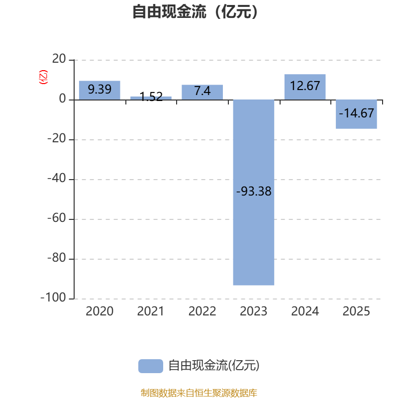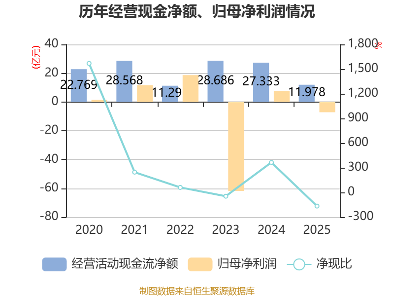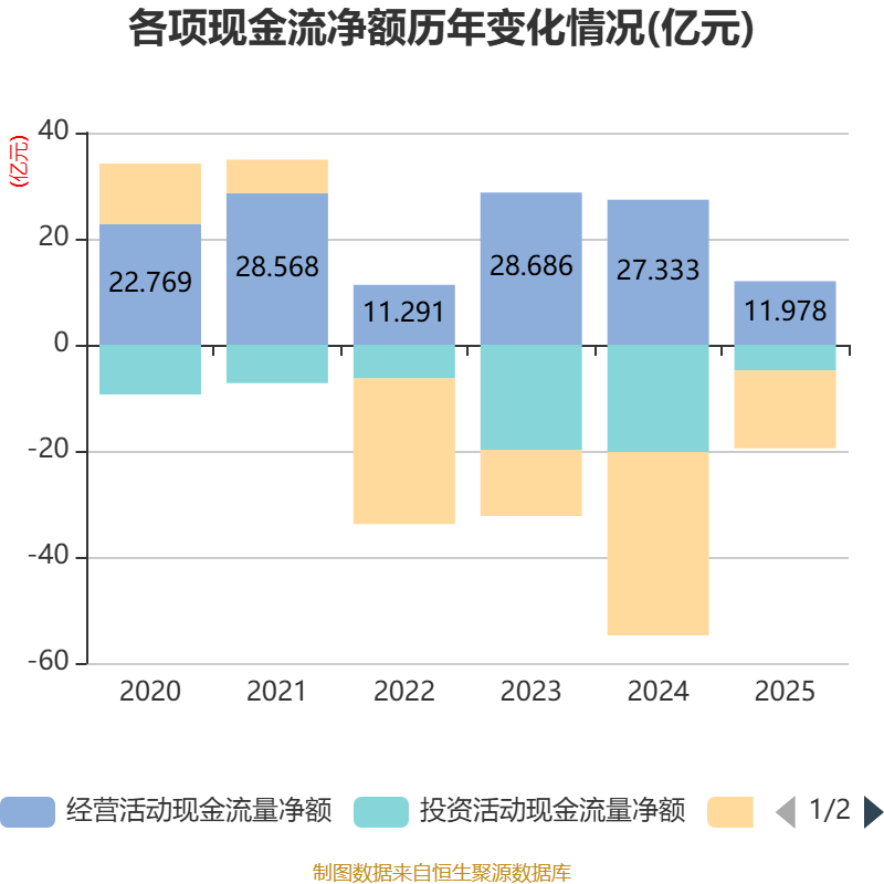 截至2025年,公司经营活动现金流净额为11.98亿元,同比下降56.18%;筹资活动现金流净额-14.7亿元,同比增加19.83亿元;投资活动现金流净额-4.83亿元,上年同期为-20.28亿元。