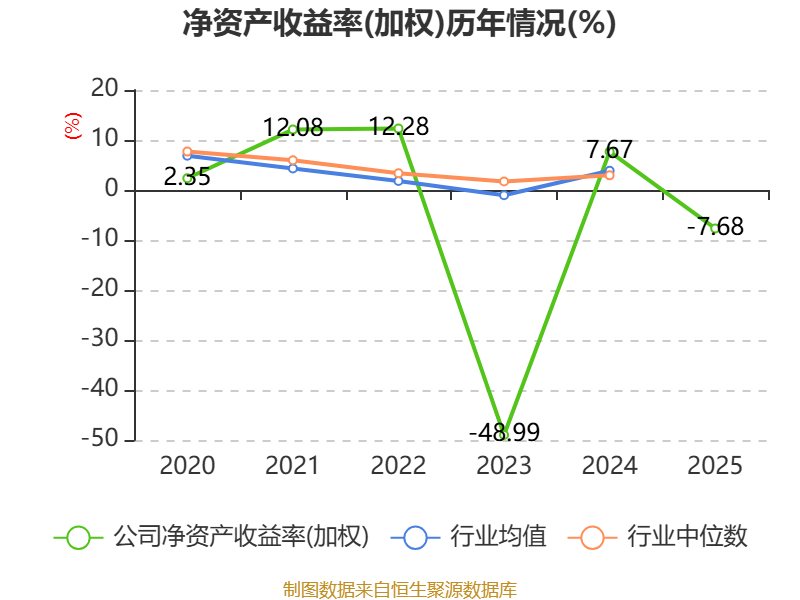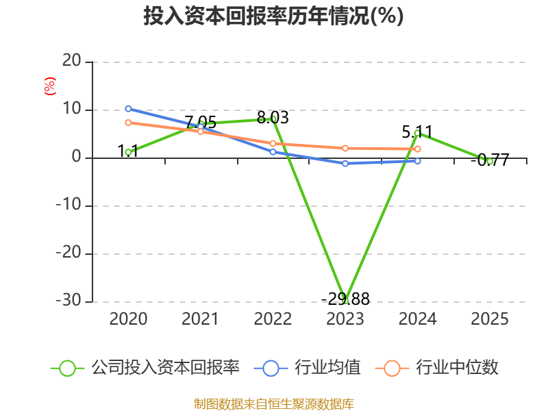 数据显示,2025年公司加权平均净资产收益率为-7.68%,较上年同期下降15.35个百分点。公司2025年投入资本回报率为-0.77%,较上年同期下降5.88个百分点。