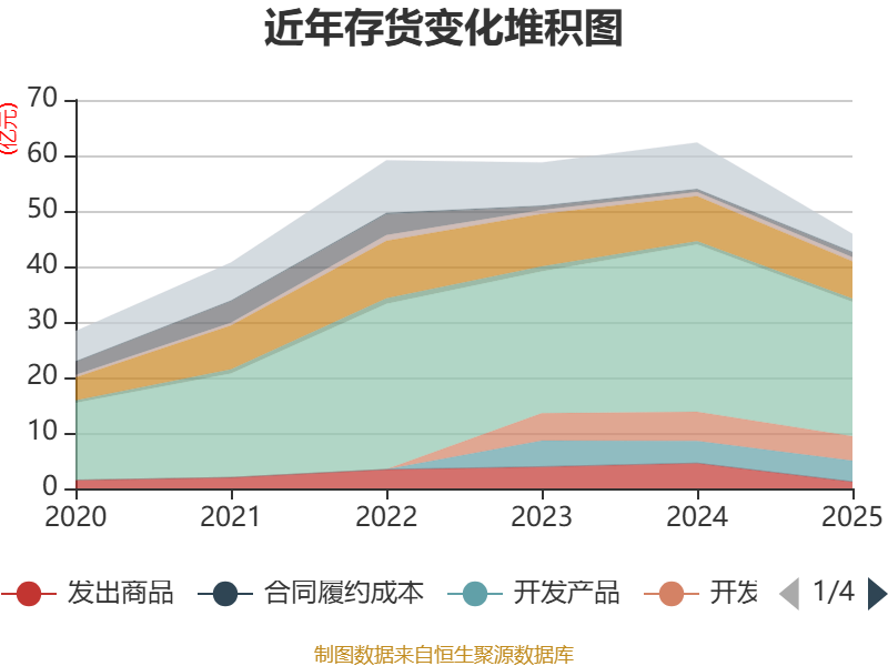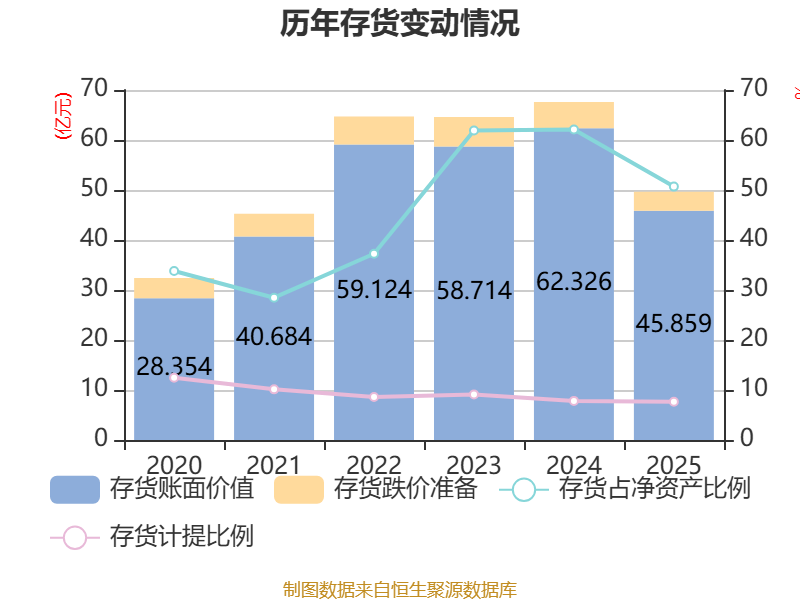 从存货变动来看,截至2025年末,公司存货账面价值为45.86亿元,占净资产的50.68%,较上年末减少16.47亿元。其中,存货跌价准备为3.8亿元,计提比例为7.64%。