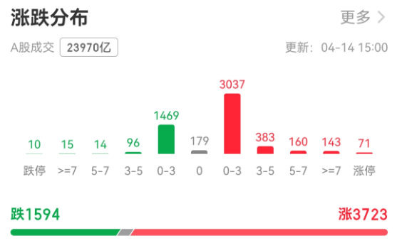 4月14日,A股三大指数高开,盘中冲高后有所回落,尾盘再度走强,集体收于全天高位。
