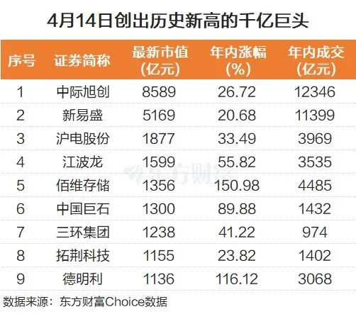 东方财富Choice数据显示,4月14日有9只千亿巨头创出历史新高,而这9只个股均和AI产业链密切相关。其中包括光模块龙头中际旭创、新易盛;PCB龙头沪电股份、中国巨石;存储龙头江波龙、佰维存储、德明利。