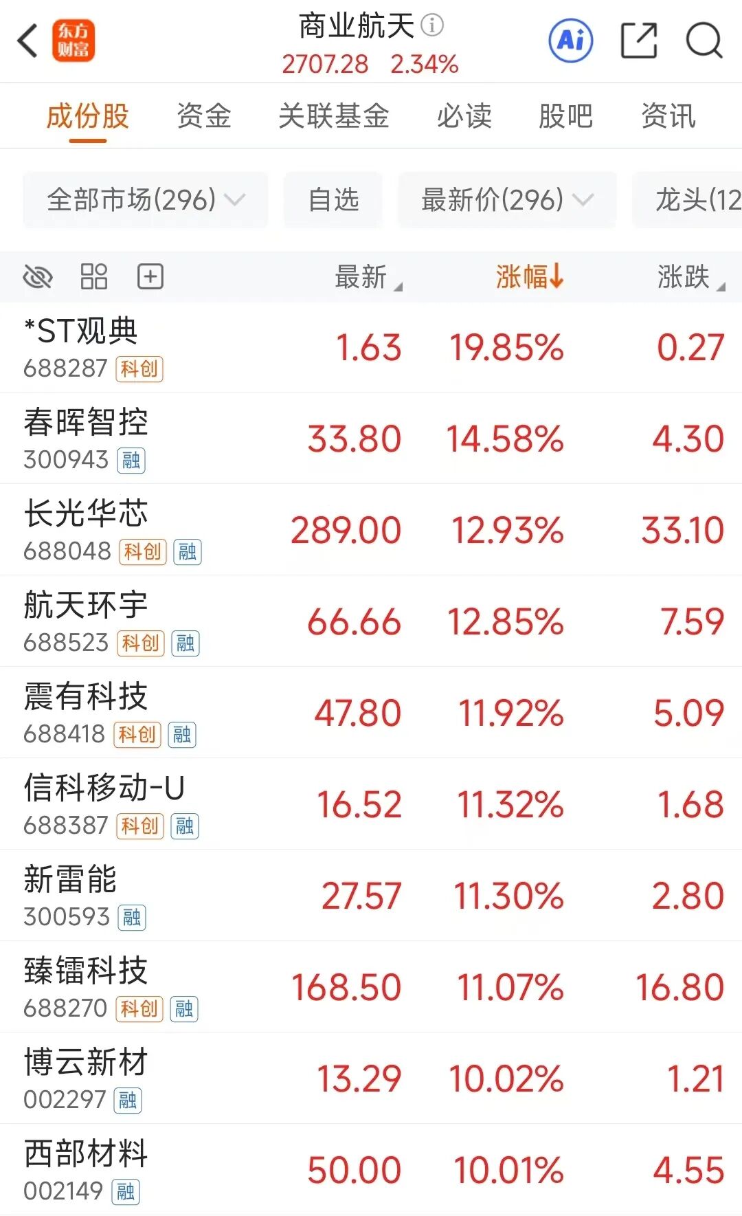 商业航天板块也表现强势,*ST观典、博云新材、西部材料涨停;春晖智控、长光华芯、航天环宇、震有科技、信科移动、新雷能、臻镭科技大涨超10%。