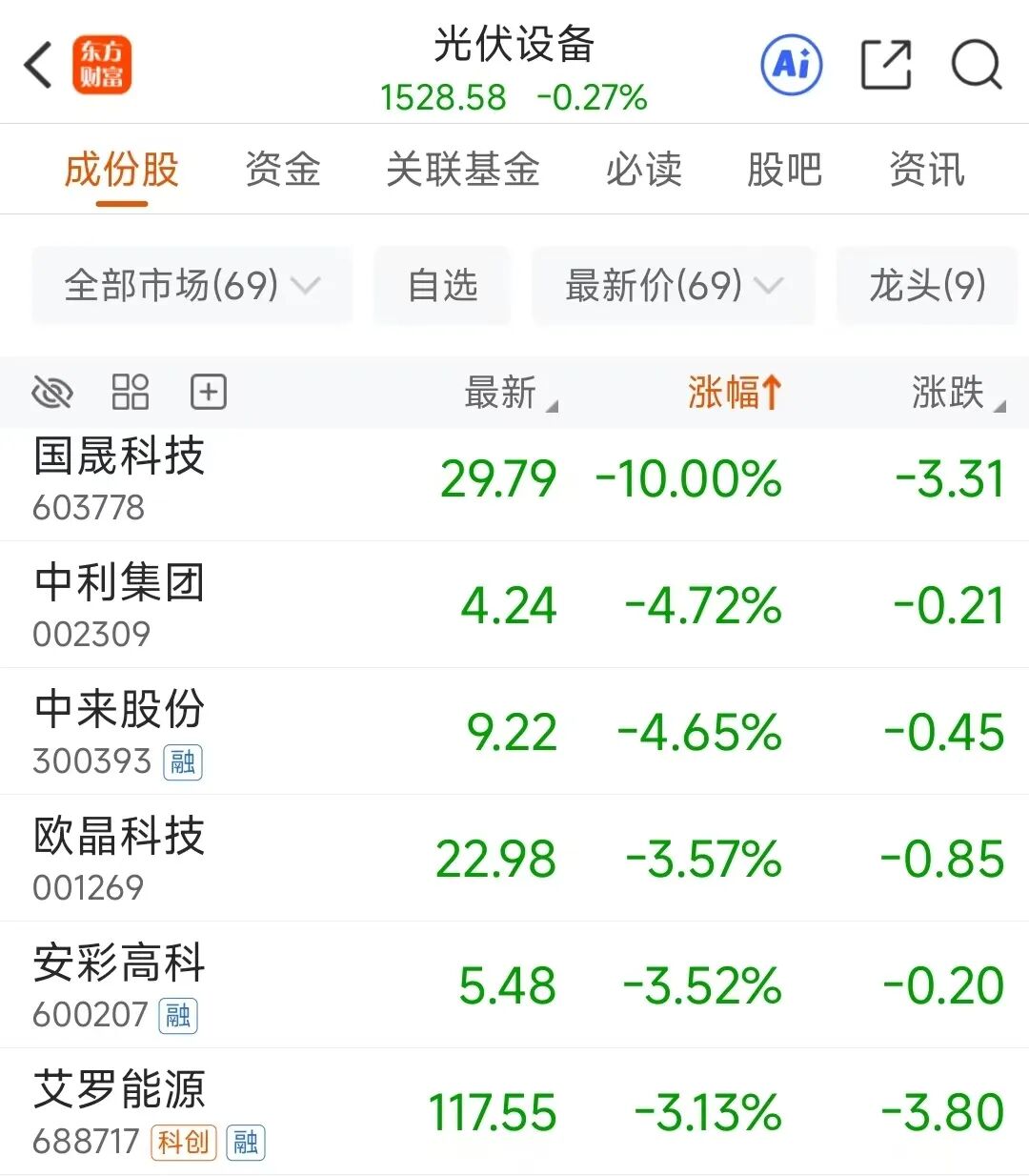 相反,前一天被“小作文”带飞的光伏设备板块,今天迎来调整。板块中国晟科技跌停;中利集团、中来股份、欧晶科技跌幅靠前。