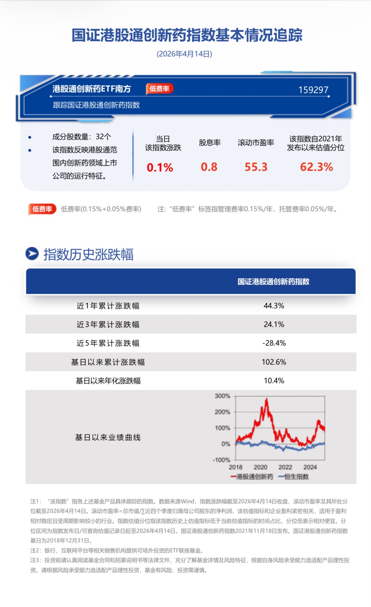 4月14日,国证港股通创新药指数在震荡中呈现稳健表现。截止收盘,该指数当日微涨0.07%,延续了近期创新药板块的修复态势。港股通创新药ETF南方(159297)成交额达1.23亿元,近20个交易日累计成交金额达43.29亿元,日均成交金额2.16亿元,换手活跃。