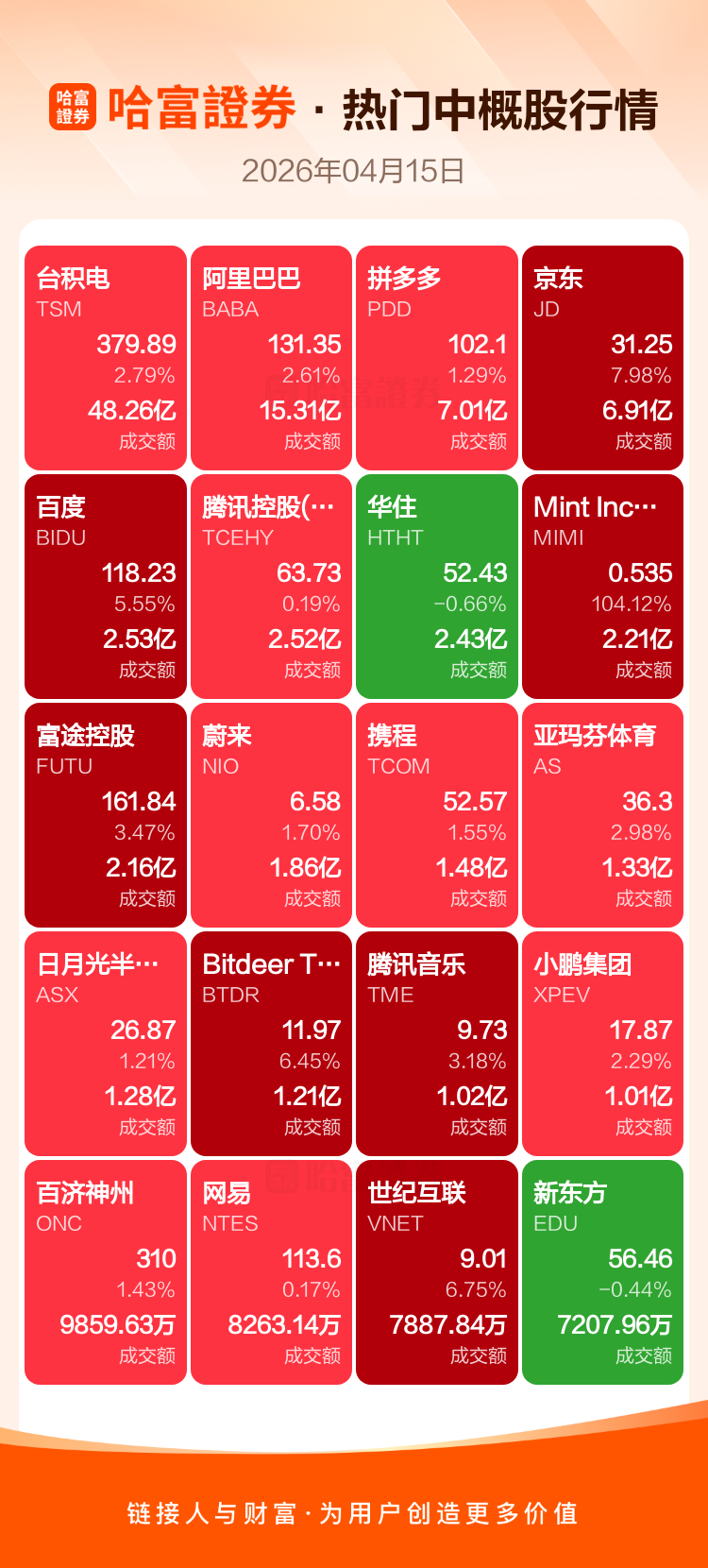 台积电涨2.79%,阿里巴巴涨2.61%,拼多多涨1.29%,京东涨7.98%,百度涨5.55%,腾讯控股(ADR)涨0.19%,华住跌0.66%,Mint Incorporation Ltd-A涨104.12%,富途控股涨3.47%,蔚来涨1.70%。