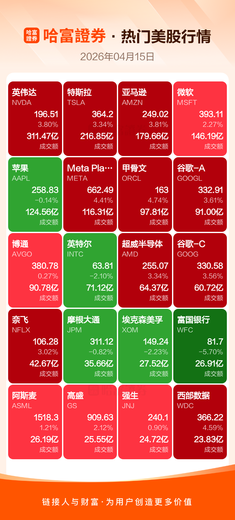 英伟达涨3.80%,特斯拉涨3.34%,亚马逊涨3.81%,微软涨2.27%,苹果跌0.14%,Meta Platforms Inc-A涨4.41%,甲骨文涨4.74%,谷歌-A涨3.61%,博通涨0.27%,英特尔跌2.10%。