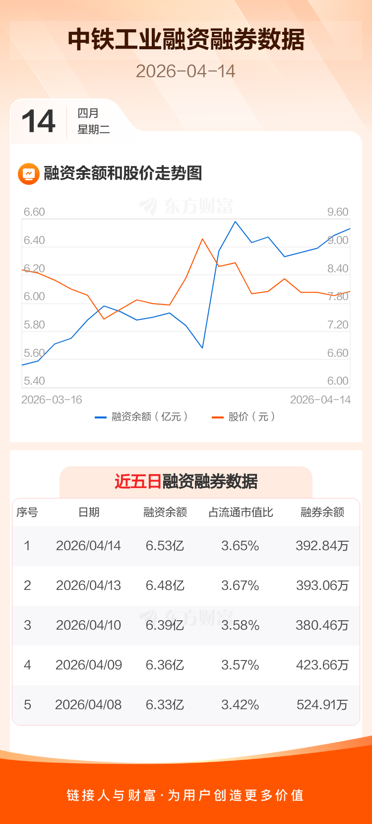 交易所最新数据显示,中铁工业于2026年4月14日获融资买入2815.18万元,融资偿还2355.64万元,当日融资净买入459.54万元。目前,该股融资余额6.53亿,占流通市值比例为3.65%。