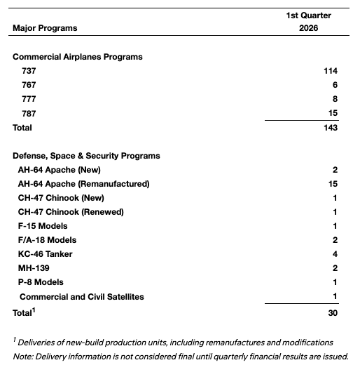 当地时间4月14日,波音公司公布2026年第一季度其在商业运营和国防业务领域的主要项目交付情况,民用飞机共交付143架,其中737飞机交付114架,787飞机交付15架。