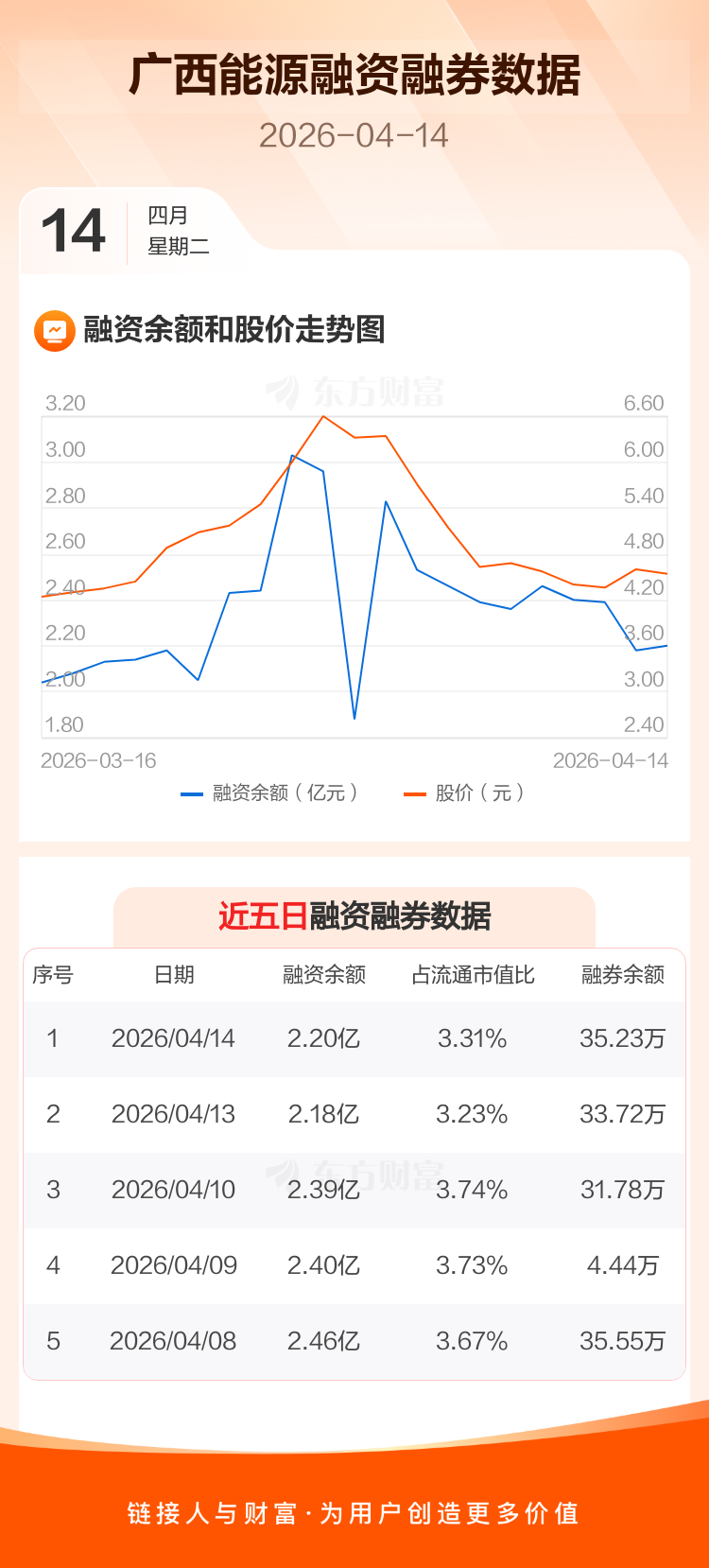 交易所最新数据显示,广西能源于2026年4月14日获融资买入5310.54万元,融资偿还5116.62万元,当日融资净买入193.92万元。目前,该股融资余额2.20亿,占流通市值比例为3.31%。