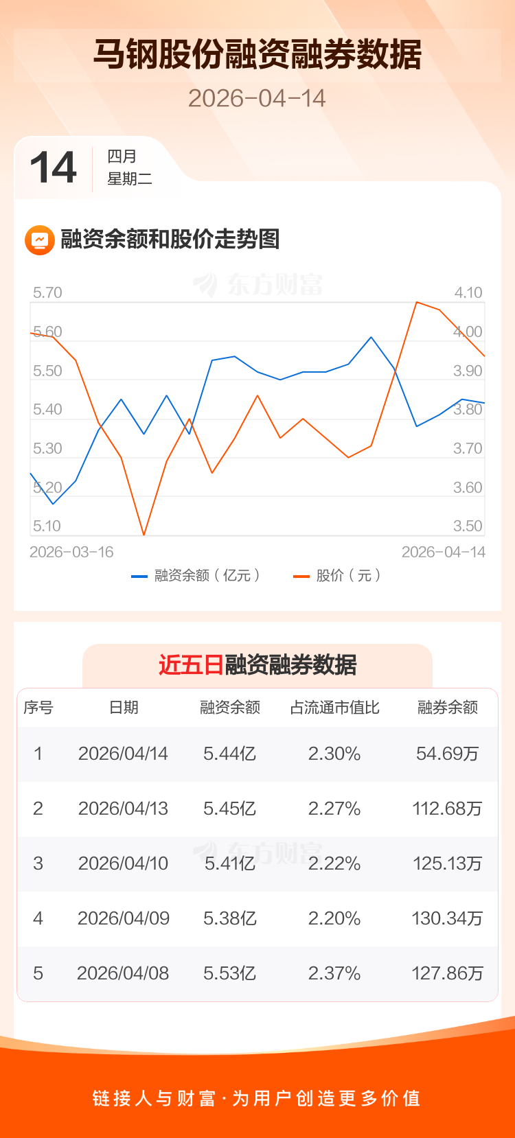 交易所最新数据显示,马钢股份于2026年4月14日获融资买入1662.05万元,融资偿还1729.72万元,当日融资净偿还67.67万元。目前,该股融资余额5.44亿,占流通市值比例为2.30%。