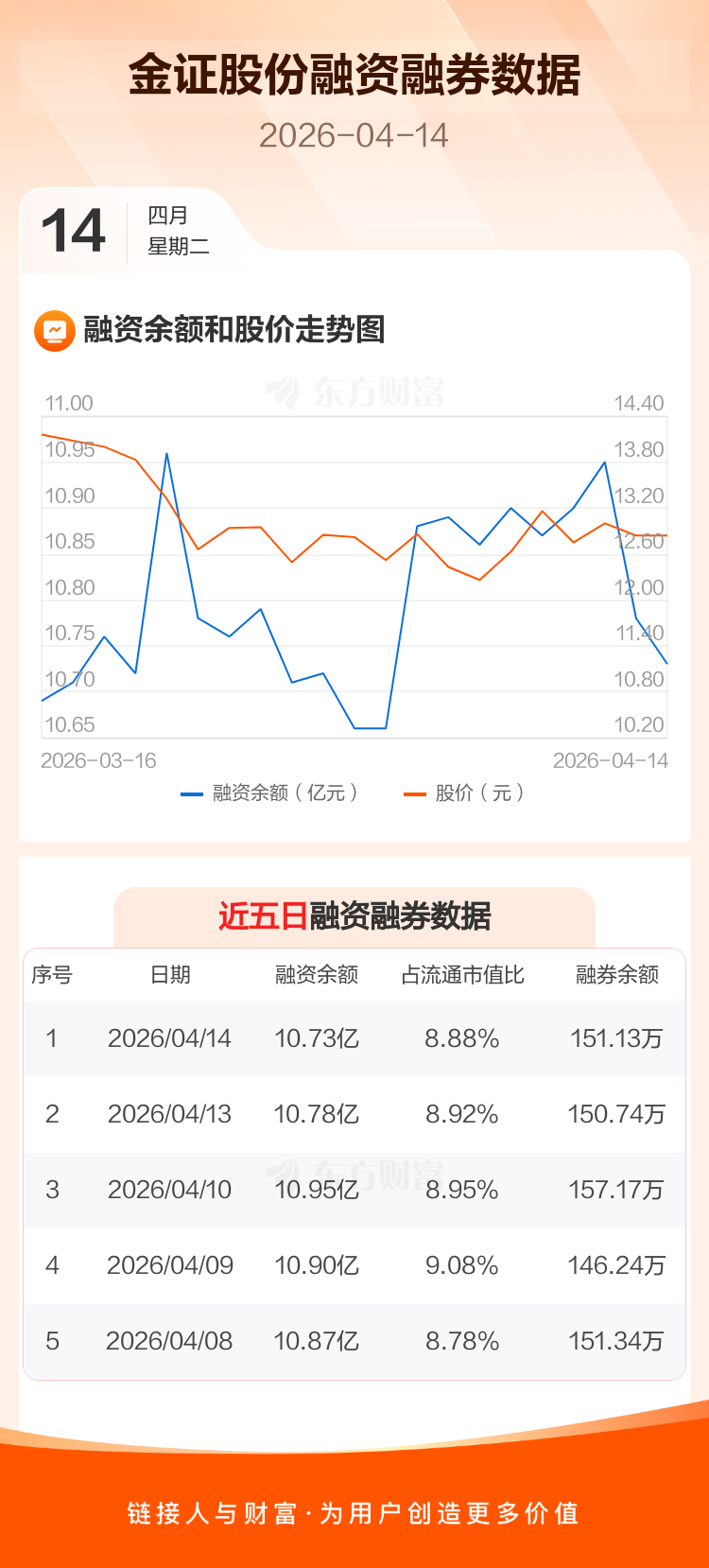 交易所最新数据显示,金证股份于2026年4月14日获融资买入2009.92万元,融资偿还2432.96万元,当日融资净偿还423.04万元。目前,该股融资余额10.73亿,占流通市值比例为8.88%。