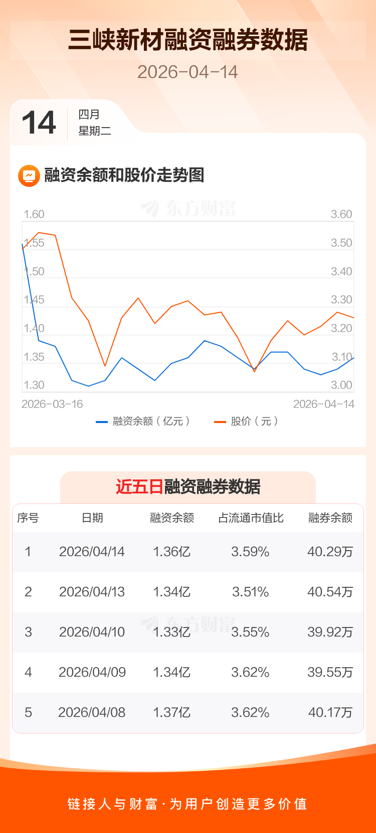 交易所最新数据显示,三峡新材于2026年4月14日获融资买入722.62万元,融资偿还496.60万元,当日融资净买入226.02万元。目前,该股融资余额1.36亿,占流通市值比例为3.59%。