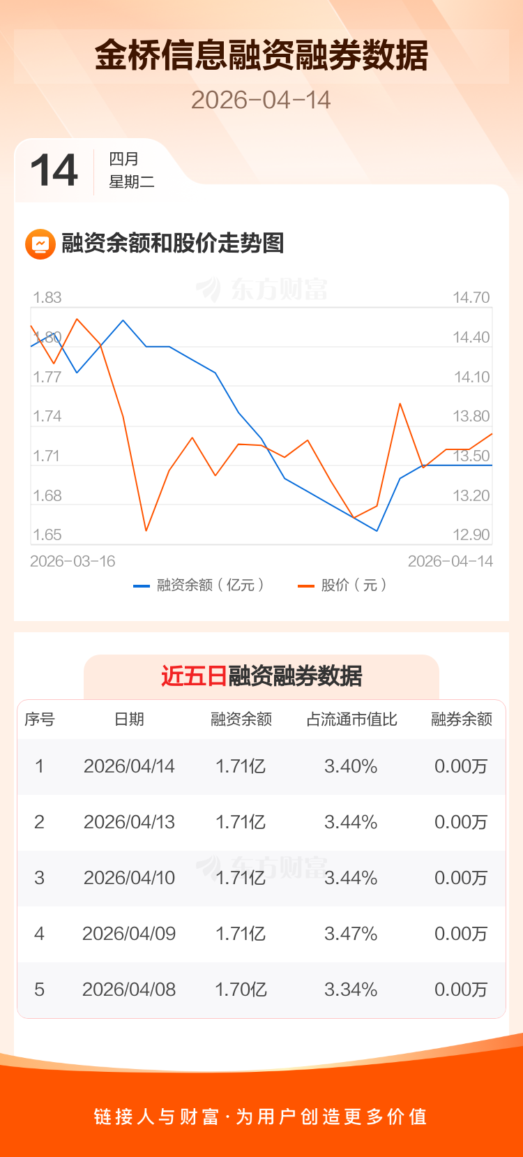 交易所最新数据显示,金桥信息于2026年4月14日获融资买入902.83万元,融资偿还957.69万元,当日融资净偿还54.86万元。目前,该股融资余额1.71亿,占流通市值比例为3.40%。