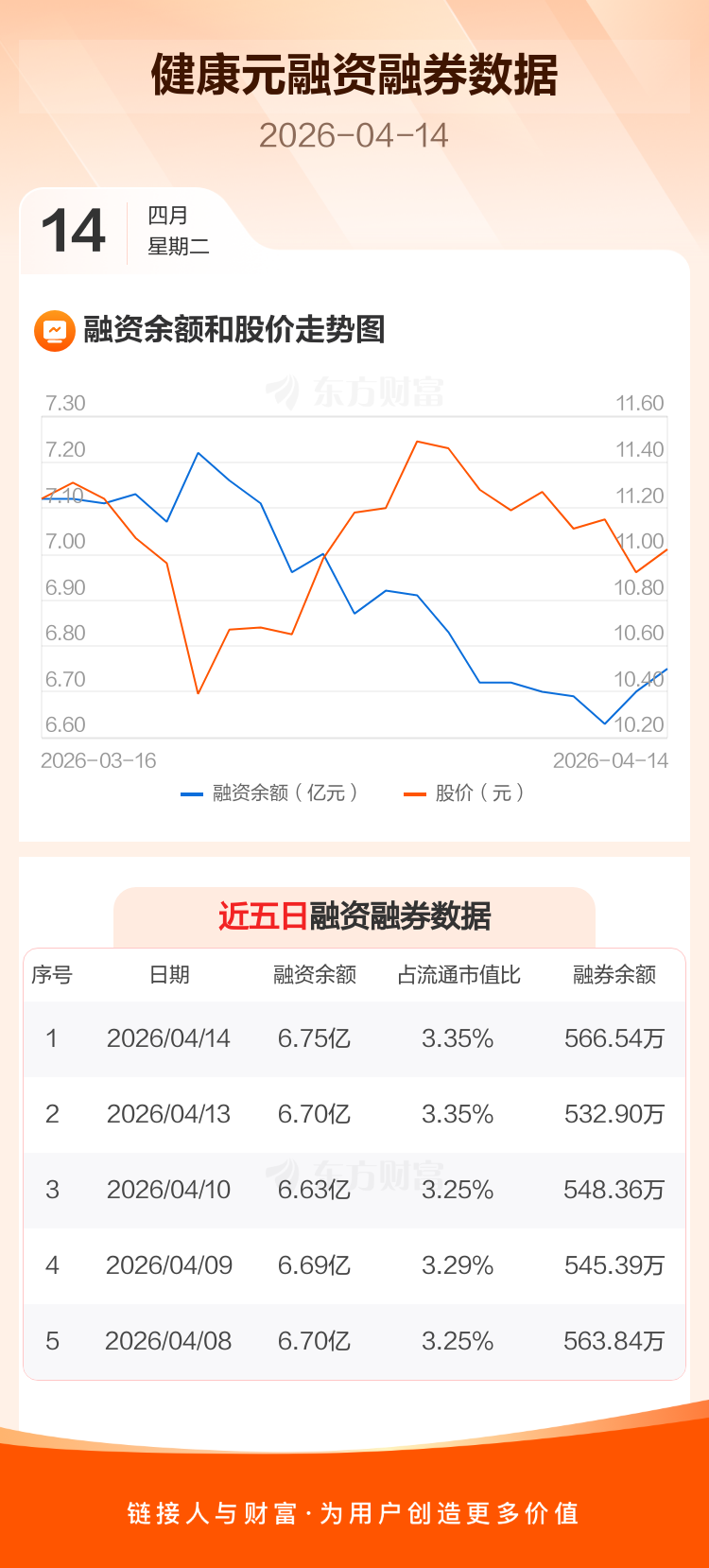 交易所最新数据显示,健康元于2026年4月14日获融资买入1387.54万元,融资偿还903.51万元,当日融资净买入484.03万元。目前,该股融资余额6.75亿,占流通市值比例为3.35%。