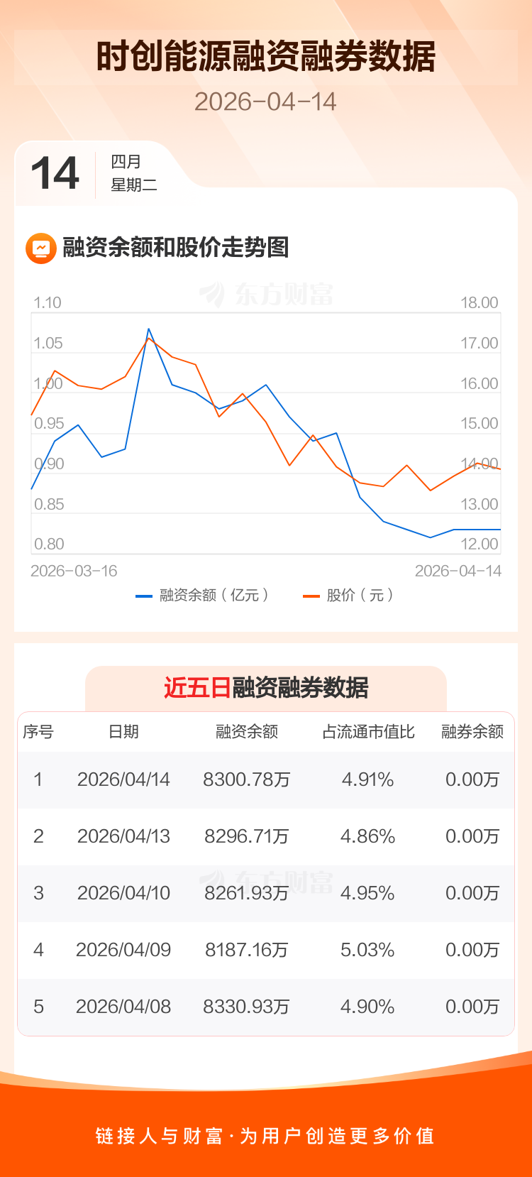 交易所最新数据显示,时创能源于2026年4月14日获融资买入408.08万元,融资偿还404.01万元,当日融资净买入4.06万元。目前,该股融资余额8300.78万,占流通市值比例为4.91%。