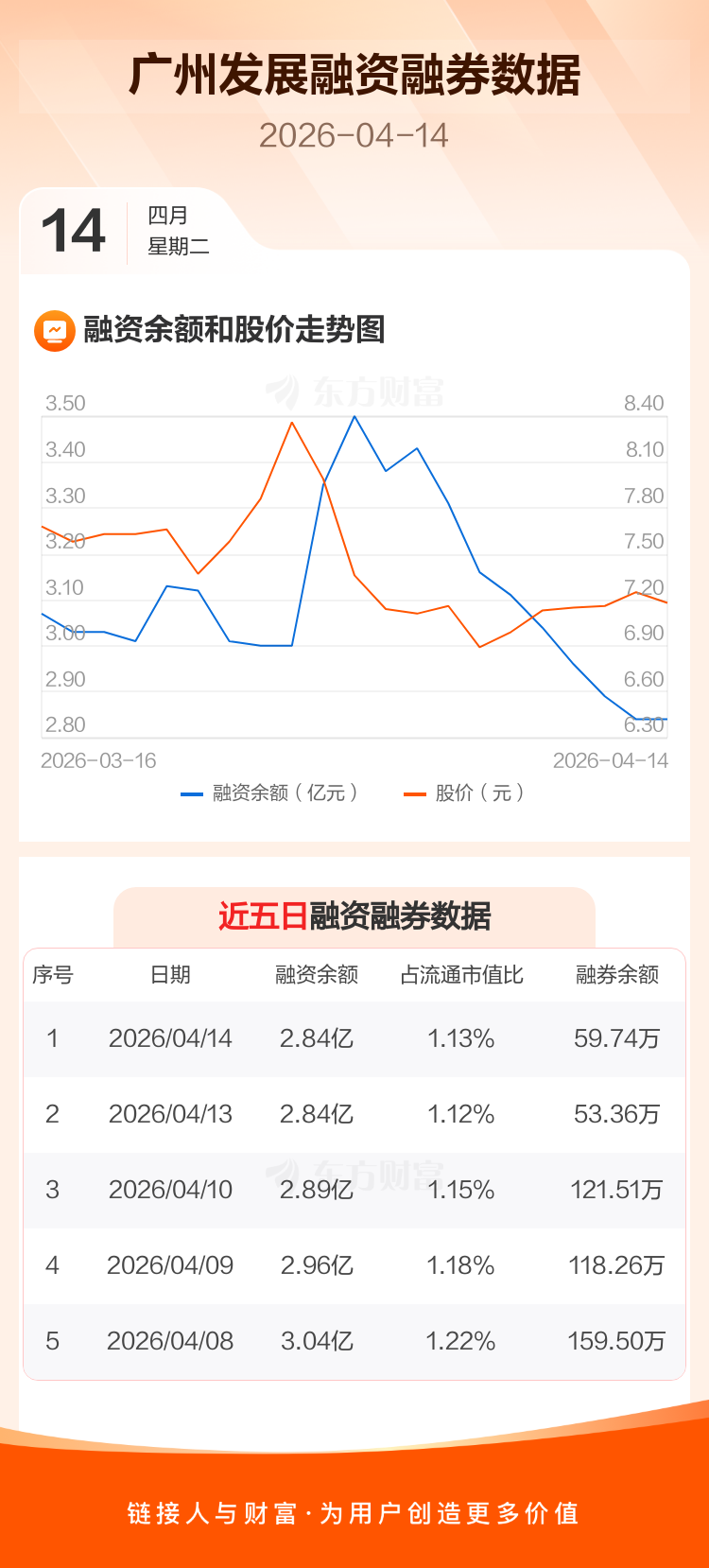 交易所最新数据显示,广州发展于2026年4月14日获融资买入1617.57万元,融资偿还1621.74万元,当日融资净偿还4.17万元。目前,该股融资余额2.84亿,占流通市值比例为1.13%。