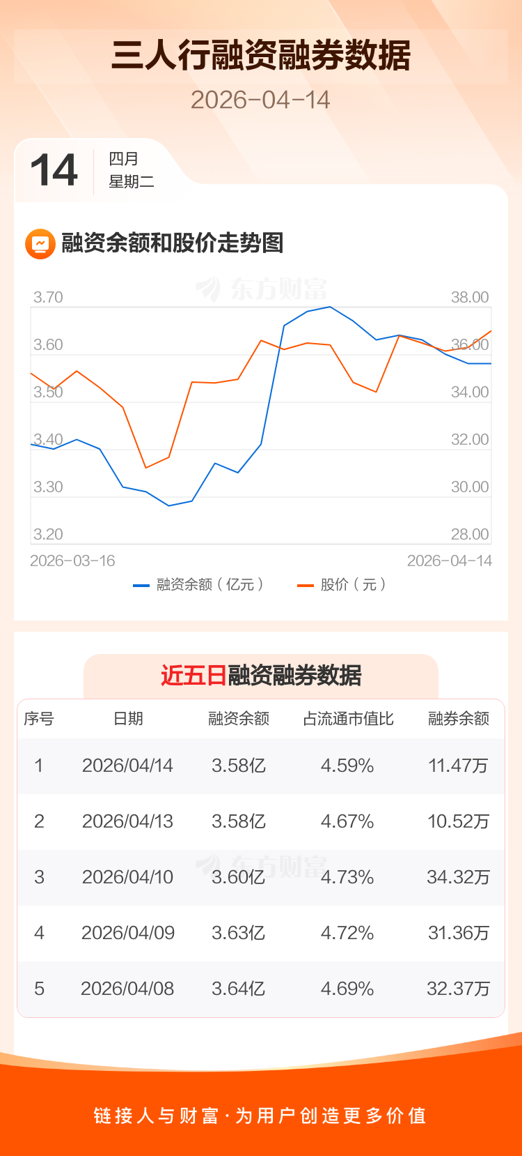 交易所最新数据显示,三人行于2026年4月14日获融资买入1427.91万元,融资偿还1369.01万元,当日融资净买入58.9万元。目前,该股融资余额3.58亿,占流通市值比例为4.59%。