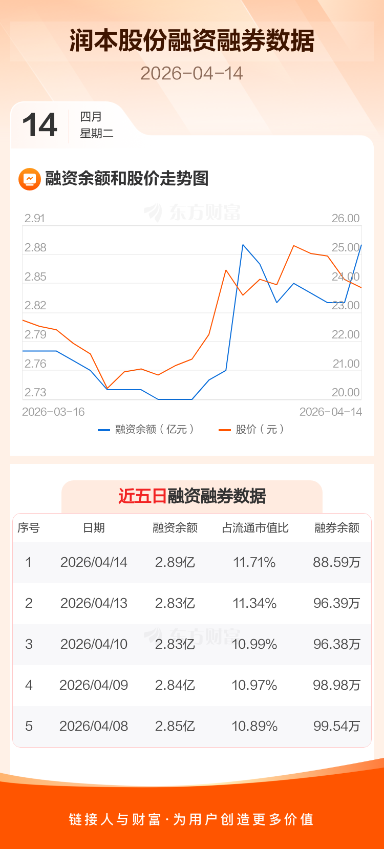 交易所最新数据显示,润本股份于2026年4月14日获融资买入1464.55万元,融资偿还884.79万元,当日融资净买入579.76万元。目前,该股融资余额2.89亿,占流通市值比例为11.71%。
