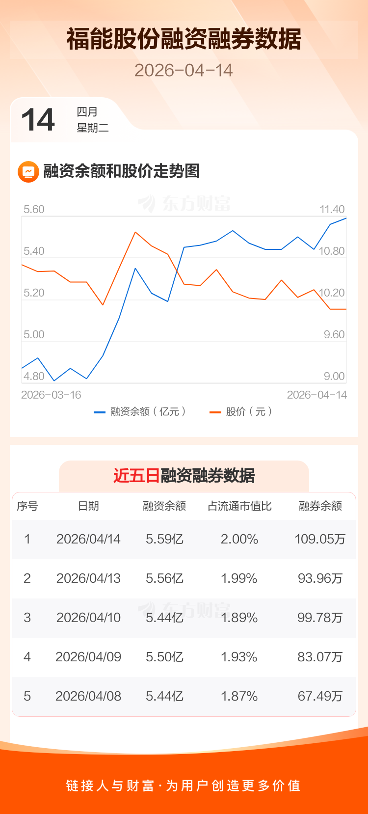 交易所最新数据显示,福能股份于2026年4月14日获融资买入1757.35万元,融资偿还1521.21万元,当日融资净买入236.14万元。目前,该股融资余额5.59亿,占流通市值比例为2.00%。