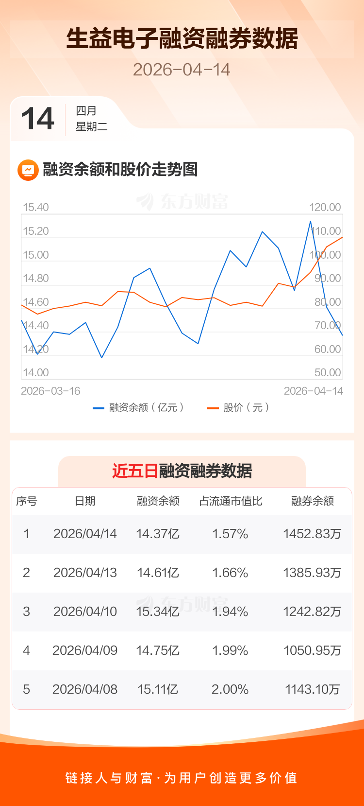 交易所最新数据显示,生益电子于2026年4月14日获融资买入4.32亿元,融资偿还4.56亿元,当日融资净偿还2402.39万元。目前,该股融资余额14.37亿,占流通市值比例为1.57%。