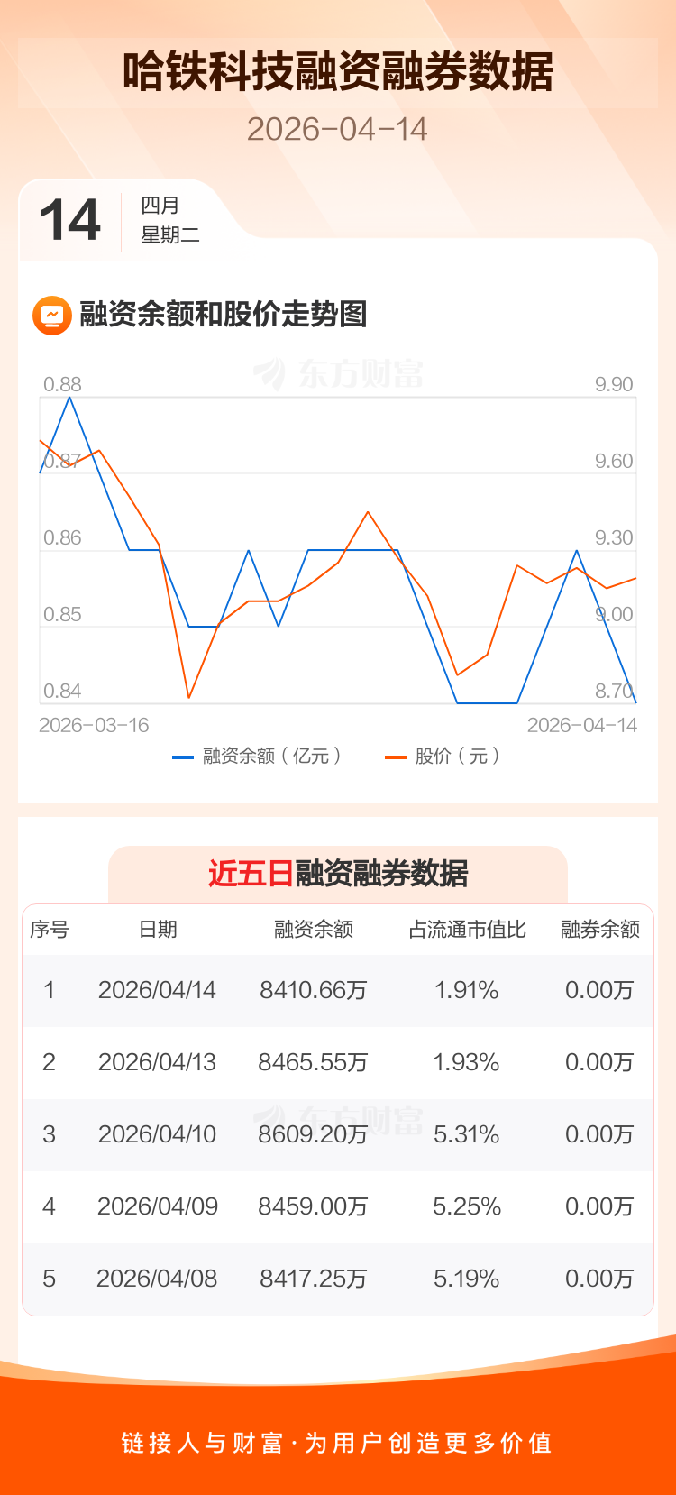 交易所最新数据显示,哈铁科技于2026年4月14日获融资买入91.80万元,融资偿还146.69万元,当日融资净偿还54.89万元。目前,该股融资余额8410.66万,占流通市值比例为1.91%。