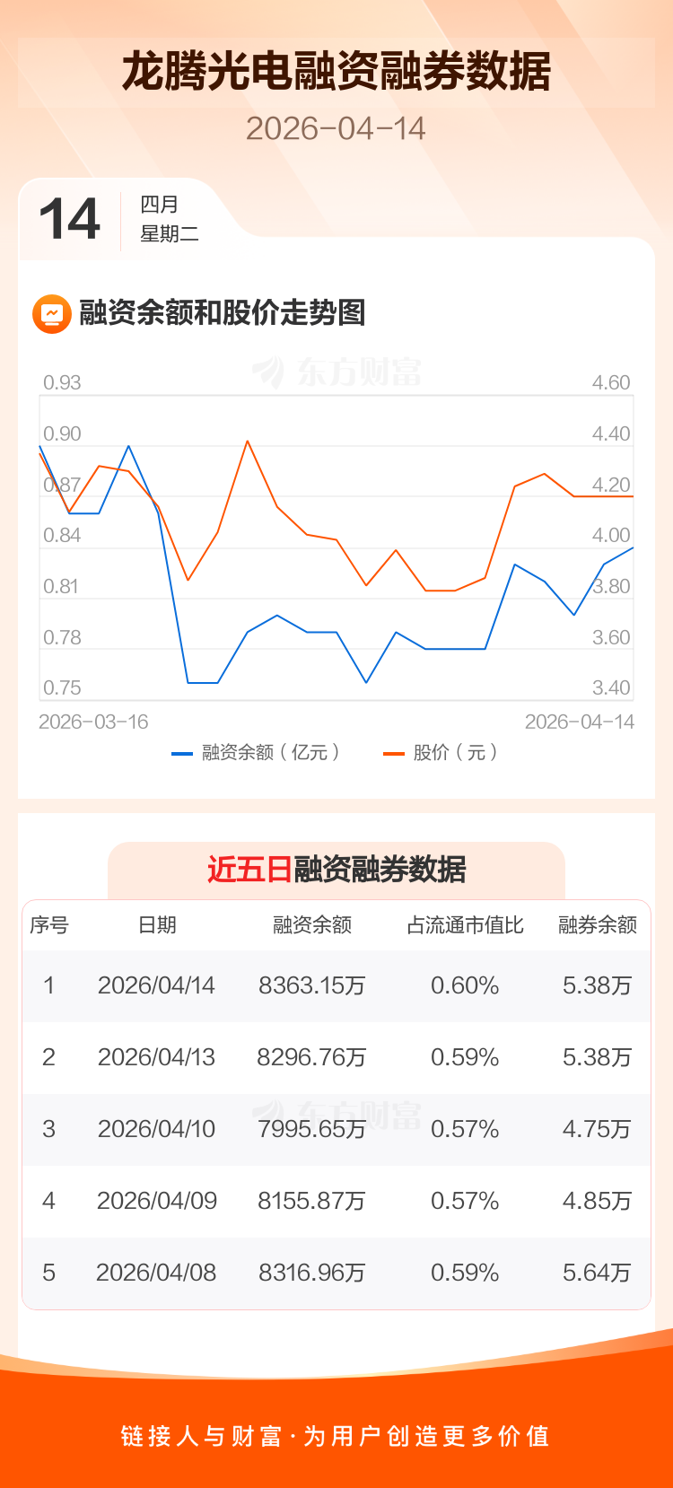 交易所最新数据显示,龙腾光电于2026年4月14日获融资买入1049.02万元,融资偿还982.62万元,当日融资净买入66.39万元。目前,该股融资余额8363.15万,占流通市值比例为0.60%。