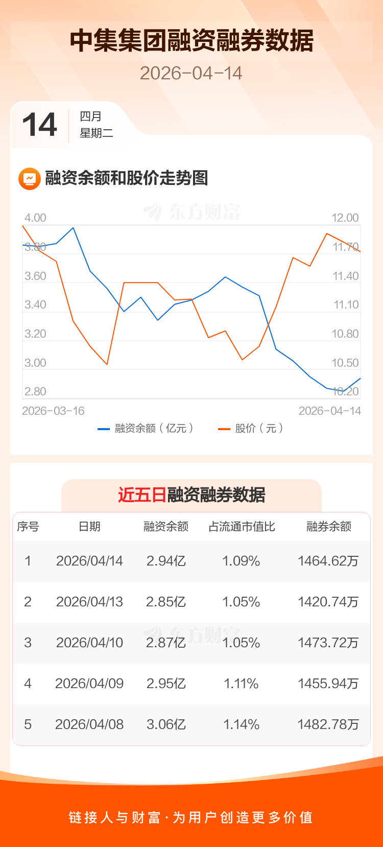 交易所最新数据显示,中集集团于2026年4月14日获融资买入3456.04万元,融资偿还2597.13万元,当日融资净买入858.91万元。目前,该股融资余额2.94亿,占流通市值比例为1.09%。
