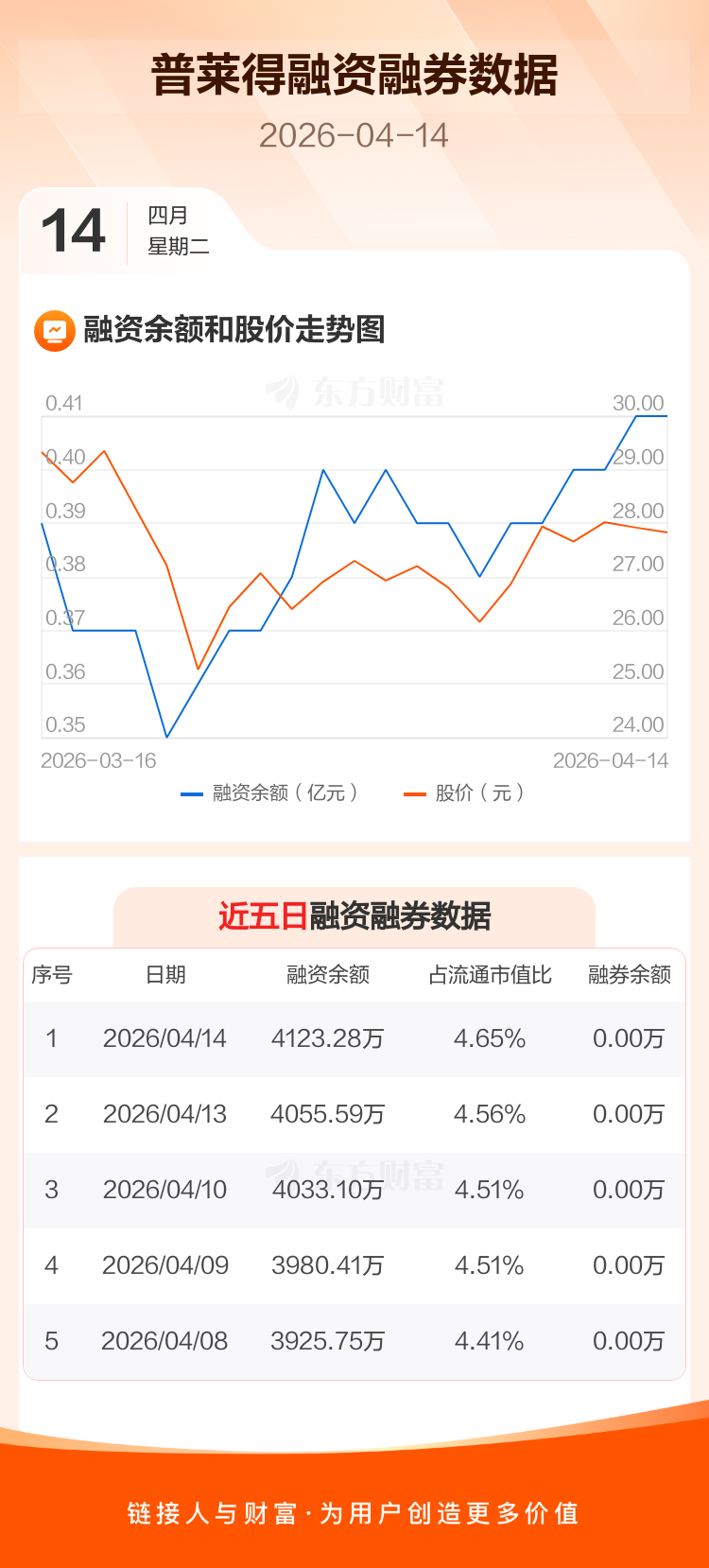 交易所最新数据显示,普莱得于2026年4月14日获融资买入193.85万元,融资偿还126.15万元,当日融资净买入67.69万元。目前,该股融资余额4123.28万,占流通市值比例为4.65%。
