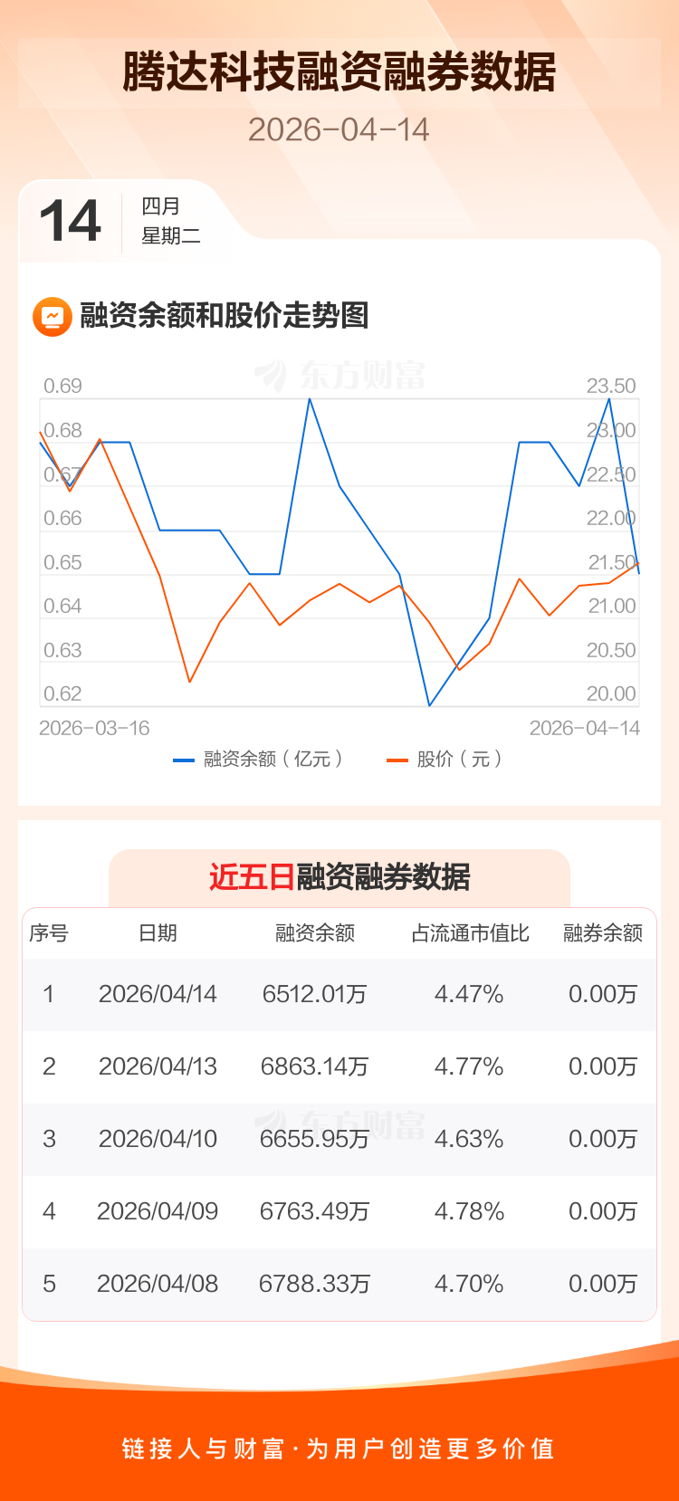 交易所最新数据显示,腾达科技于2026年4月14日获融资买入247.83万元,融资偿还598.95万元,当日融资净偿还351.13万元。目前,该股融资余额6512.01万,占流通市值比例为4.47%。