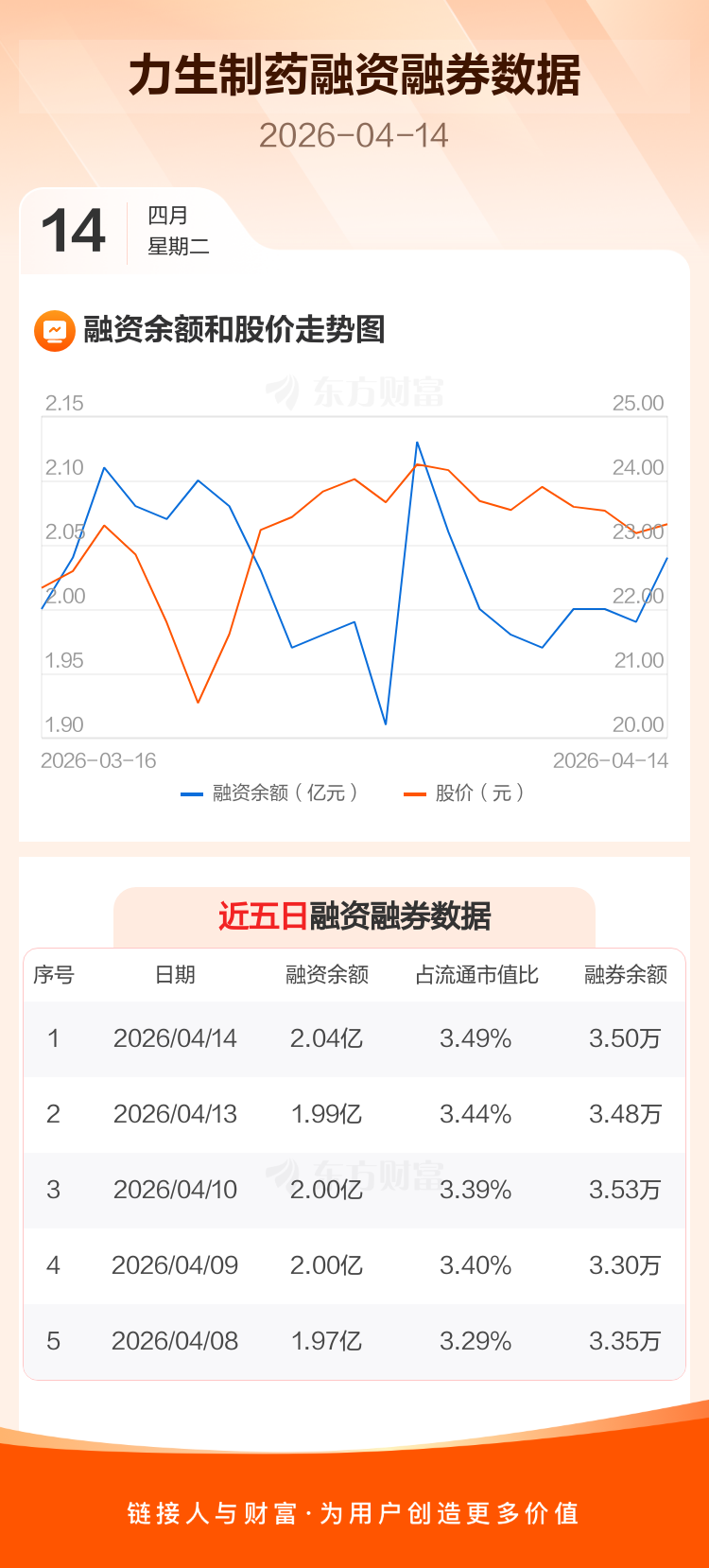 交易所最新数据显示,力生制药于2026年4月14日获融资买入1393.71万元,融资偿还958.32万元,当日融资净买入435.39万元。目前,该股融资余额2.04亿,占流通市值比例为3.49%。