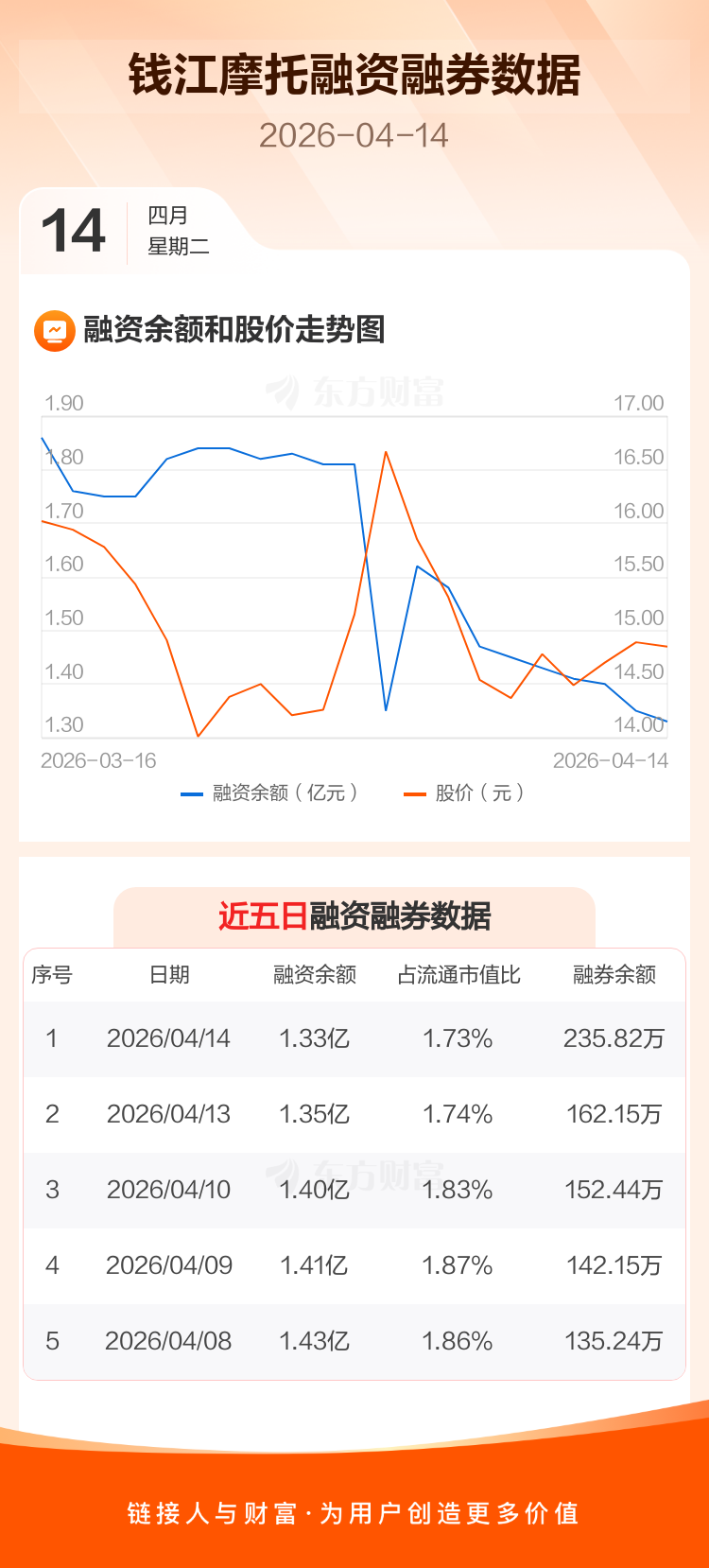 交易所最新数据显示,钱江摩托于2026年4月14日获融资买入566.49万元,融资偿还730.80万元,当日融资净偿还164.31万元。目前,该股融资余额1.33亿,占流通市值比例为1.73%。